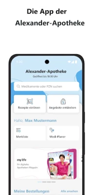 Ihre Gesundheit verdient die beste Unterstützung – und die Alexander Apotheke bringt sie direkt auf Ihr Smartphone. Entdecken Sie eine neue Dimension der Apothekenversorgung, die sich perfekt in Ihren Alltag integriert. Mit der intuitiven Alexander Apotheke App bestellen Sie Ihre benötigten Medikamente und Gesundheitsprodukte mühelos. Lösen Sie digitale E-Rezepte schnell und sicher ein, indem Sie einfach Ihre Gesundheitskarte oder Ihr Papierrezept scannen. Kein Warten, kein unnötiger Aufwand – Ihre Apotheke, so flexibel wie nie zuvor.