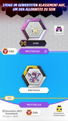 Ihre Entwicklung wird stets belohnt. Jede neue Erweiterung bringt einen frischen Kampfpass mit sich, der Ihnen kostenlosen Zugang zu zwei kompetitiven Decks, zahlreichen Boosterpacks und exklusiven kosmetischen Gegenständen wie Münzen, Deckboxen und Kartenhüllen verschafft. Entdecken Sie seltene Alternativkarten, um Ihrem Deck eine persönliche Note zu verleihen. Haben Sie Ihr Können geschliffen, warten die Wettbewerbsligen auf Sie. Kämpfen Sie sich durch die Ränge mit dem ultimativen Ziel, die prestigeträchtige Arceus-Liga zu erreichen und Ihren Status als einer der Besten zu untermauern. Zusätzlich dazu bieten die dynamischen Trainer-Tests und zeitlich begrenzten Herausforderungen wie die Silber-Serie oder die Arenaleiter-Herausforderung fortlaufend neue Möglichkeiten, Ihre Decks und Strategien unter Beweis zu stellen, während die Ungewerteten Formate (einschließlich des Erweiterten Formats mit Karten bis zur Serie Sonne & Mond) ideale Bedingungen für lockeres Experimentieren schaffen. Erleben Sie nahtloses Spielvergnügen mit einer einzigen Kartensammlung auf Mobilgeräten, PCs und Macs, indem Sie sich einfach mit Ihrem Pokémon-Trainer-Club-Konto anmelden.