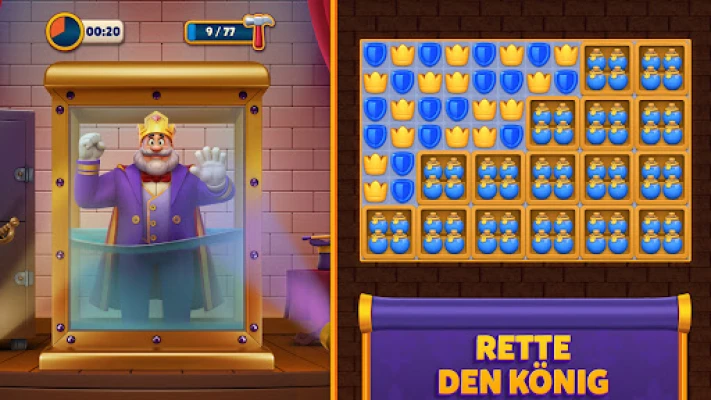 König Robert steht vor einer königlichen Herausforderung: Sein prachtvolles Schloss bedarf einer dringend benötigten Auffrischung, und er benötigt Ihre Expertise, um es wieder in altem Glanz erstrahlen zu lassen. Tauchen Sie ein in die fesselnde Welt von Royal Match, wo Sie nach jeder erfolgreich gemeisterten 3-Gewinnt-Partie die Früchte Ihrer Arbeit ernten können. Verwandeln Sie Zimmer für Zimmer, vom königlichen Gemach bis zur weitläufigen Küche, in wahre Kunstwerke. Mit den verdienten Münzen gestalten Sie nicht nur ein stilvolles Zuhause, sondern schalten auch wertvolle Boni und mächtige Booster frei, die Ihre Reise durch die Saga von Royal Match bereichern.